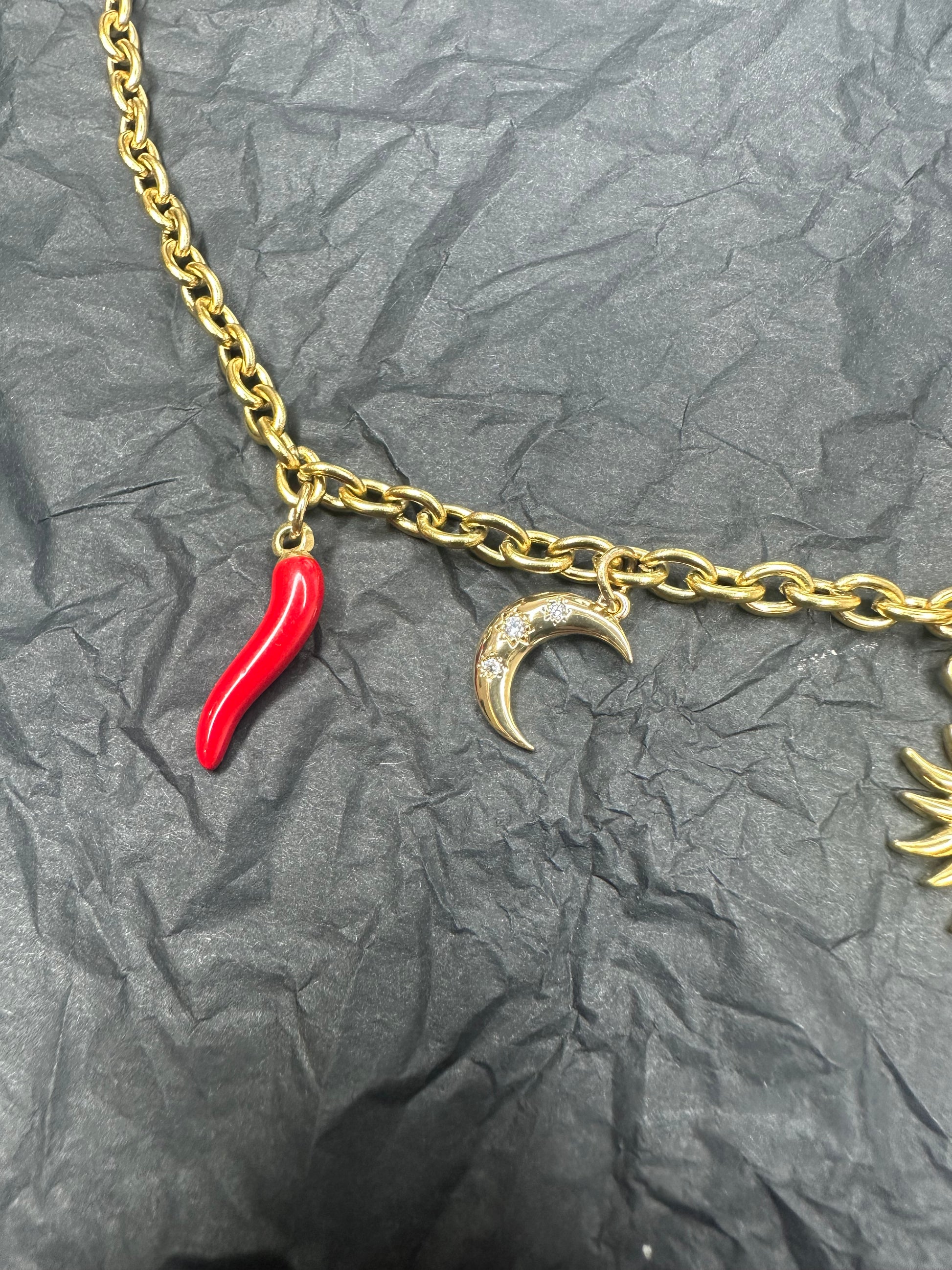 The Cosmic Charm Necklace - 18k gold-plated round link necklace is styled with a bold chain and adorned with striking charms — the moon, sun, star, and red cornicello talismans. A unique fusion of celestial energy and symbolic protection, making it a statement piece with meaning.