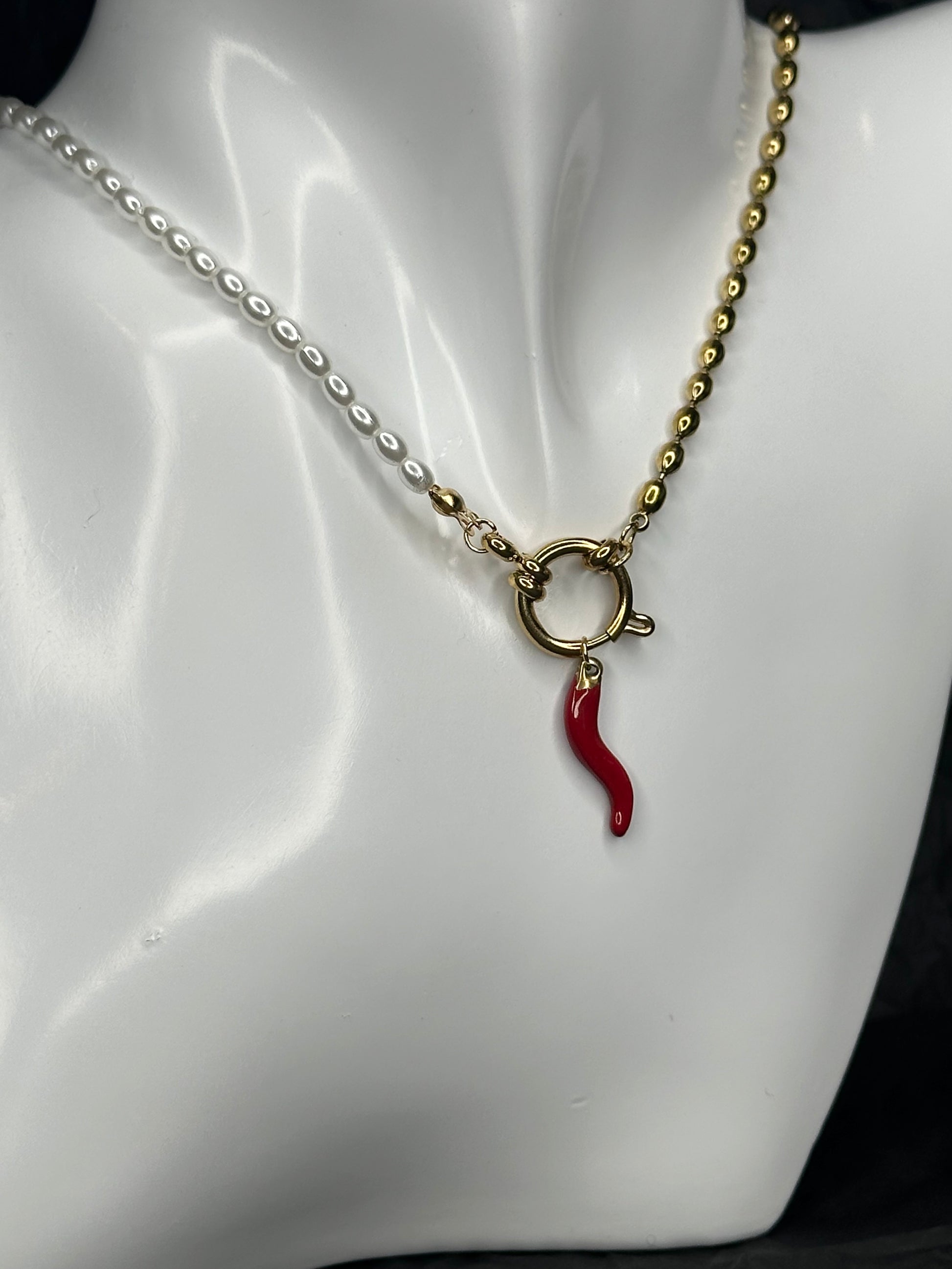 Elevate your look with the Dual Essence Necklace — a bold fusion of stainless steel 18k gold plating and elegant imitation pearls. Designed with a striking half-and-half balance, this piece is finished with a central spring clasp that secures the signature red cornice horn pendant, symbolizing strength and protection. The clasp also allows you to add your own charm or pendant, making it a truly personal statement piece.