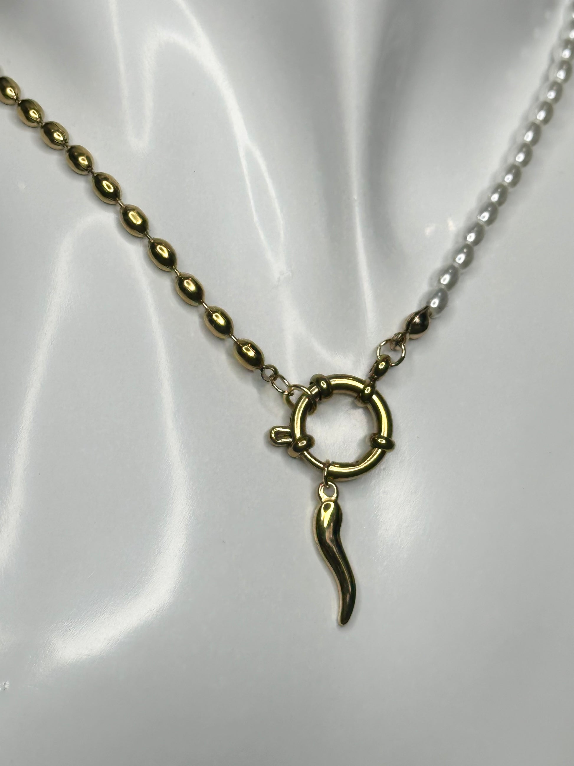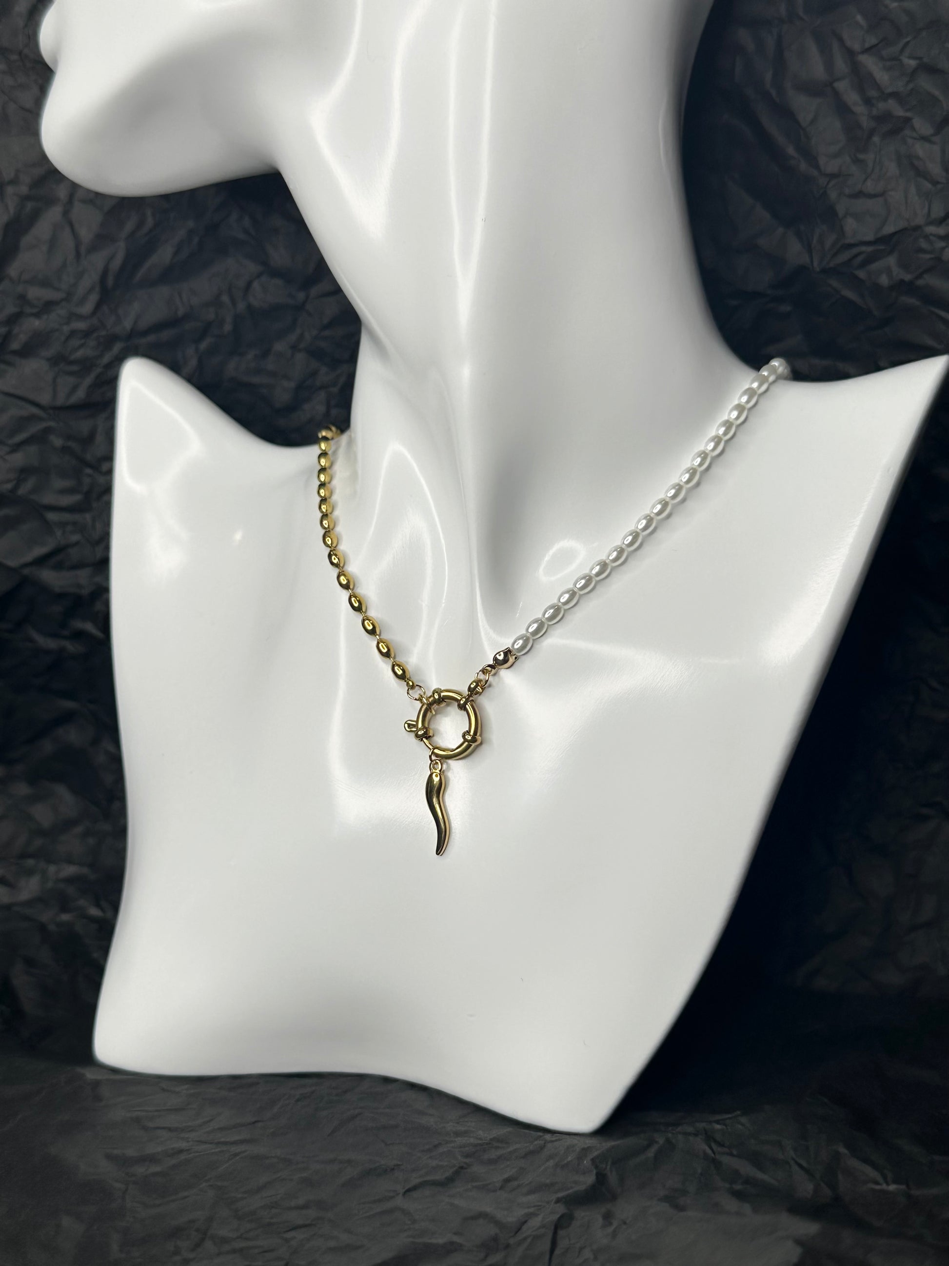 Elevate your look with the Dual Essence Necklace — a bold fusion of stainless steel 18k gold plating and elegant imitation pearls. Designed with a striking half-and-half balance, this piece is finished with a central spring clasp that secures the signature gold cornice horn pendant, symbolizing strength and protection. The clasp also allows you to add your own charm or pendant, making it a truly personal statement piece.
