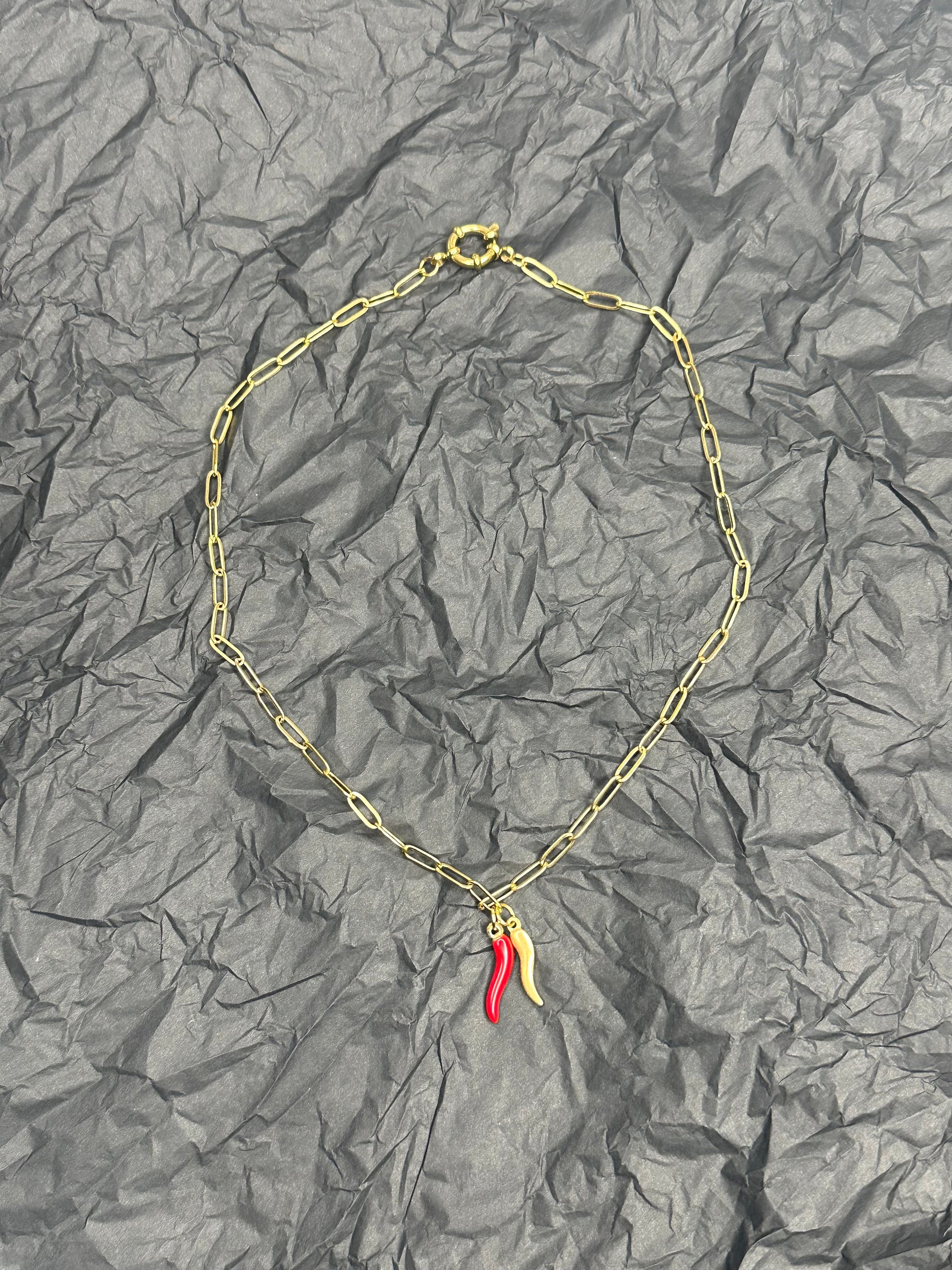 A stylish two-layered 18k gold-plated paperclip necklace featuring elongated chain links and accented with twin charms — a sleek gold cornicello and a vibrant red cornicello. Symbolizing protection and good fortune. It is also versatile as it can be worn together or separately. This piece blends elegance with meaning.
