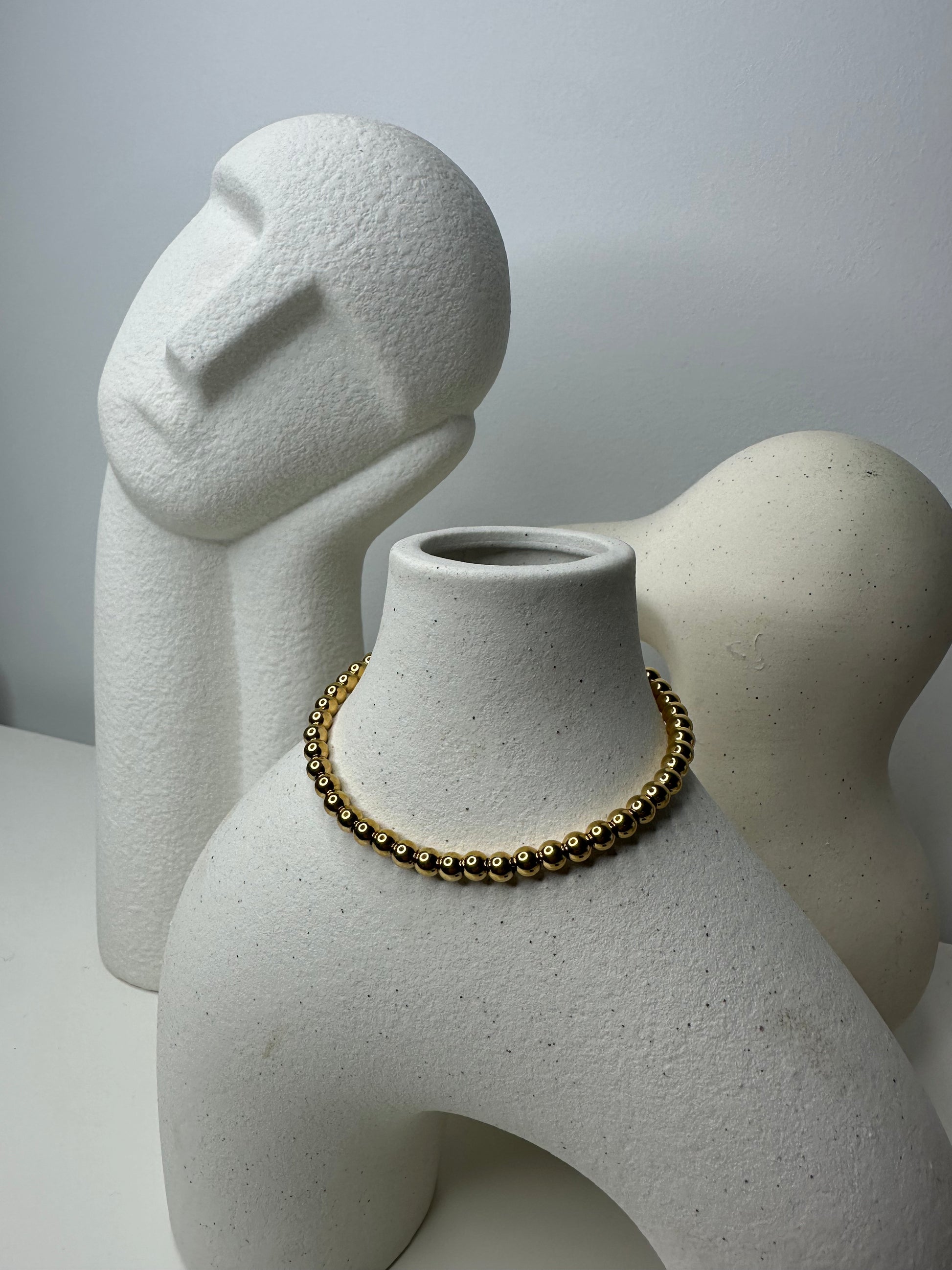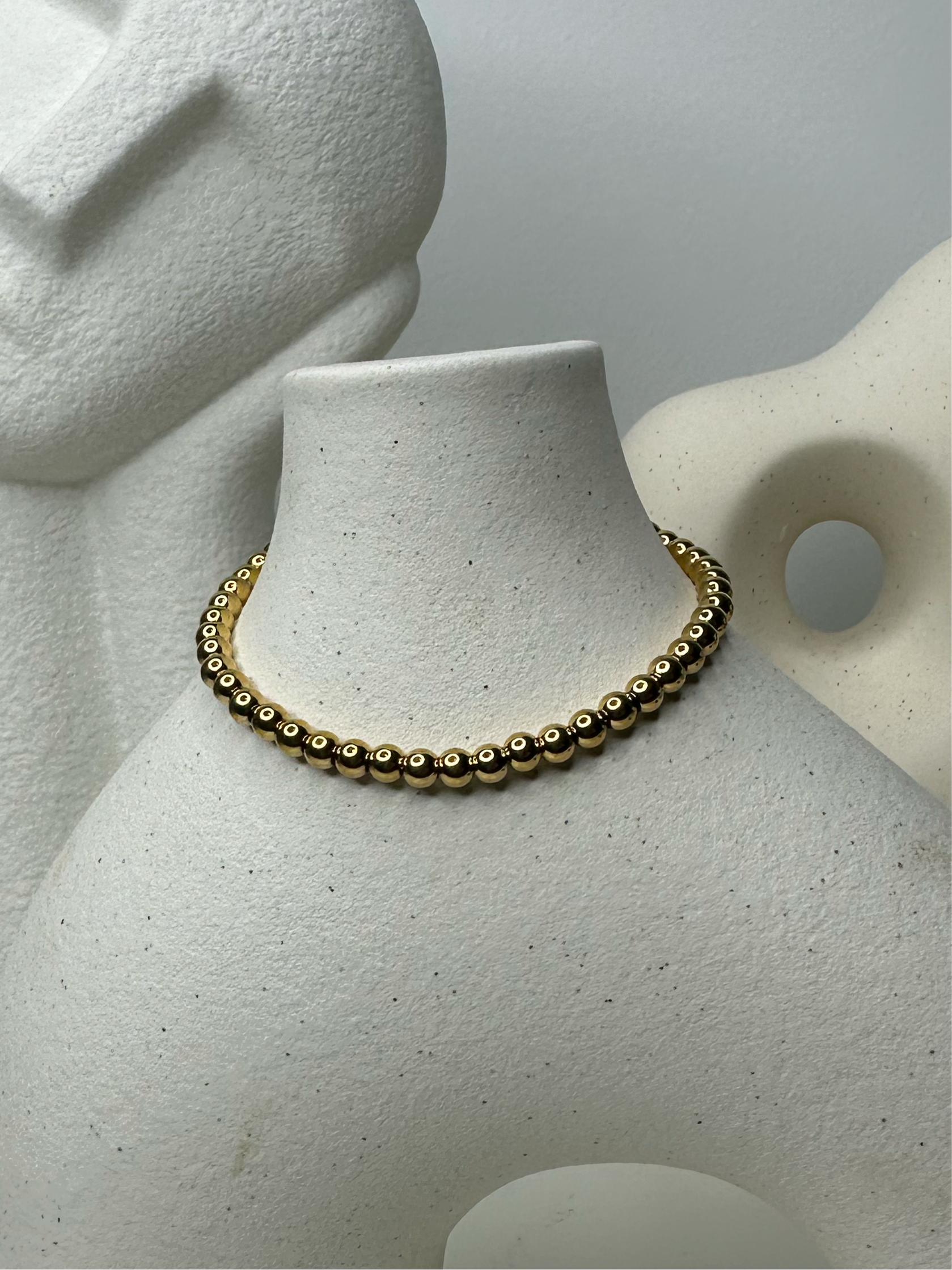 This gold bead bracelet features a sleek and minimal design, crafted with polished gold spheres that create a timeless and versatile look. Lightweight and comfortable, it’s perfect for stacking or wearing alone as a subtle statement piece. An elegant addition to any jewellery collection.