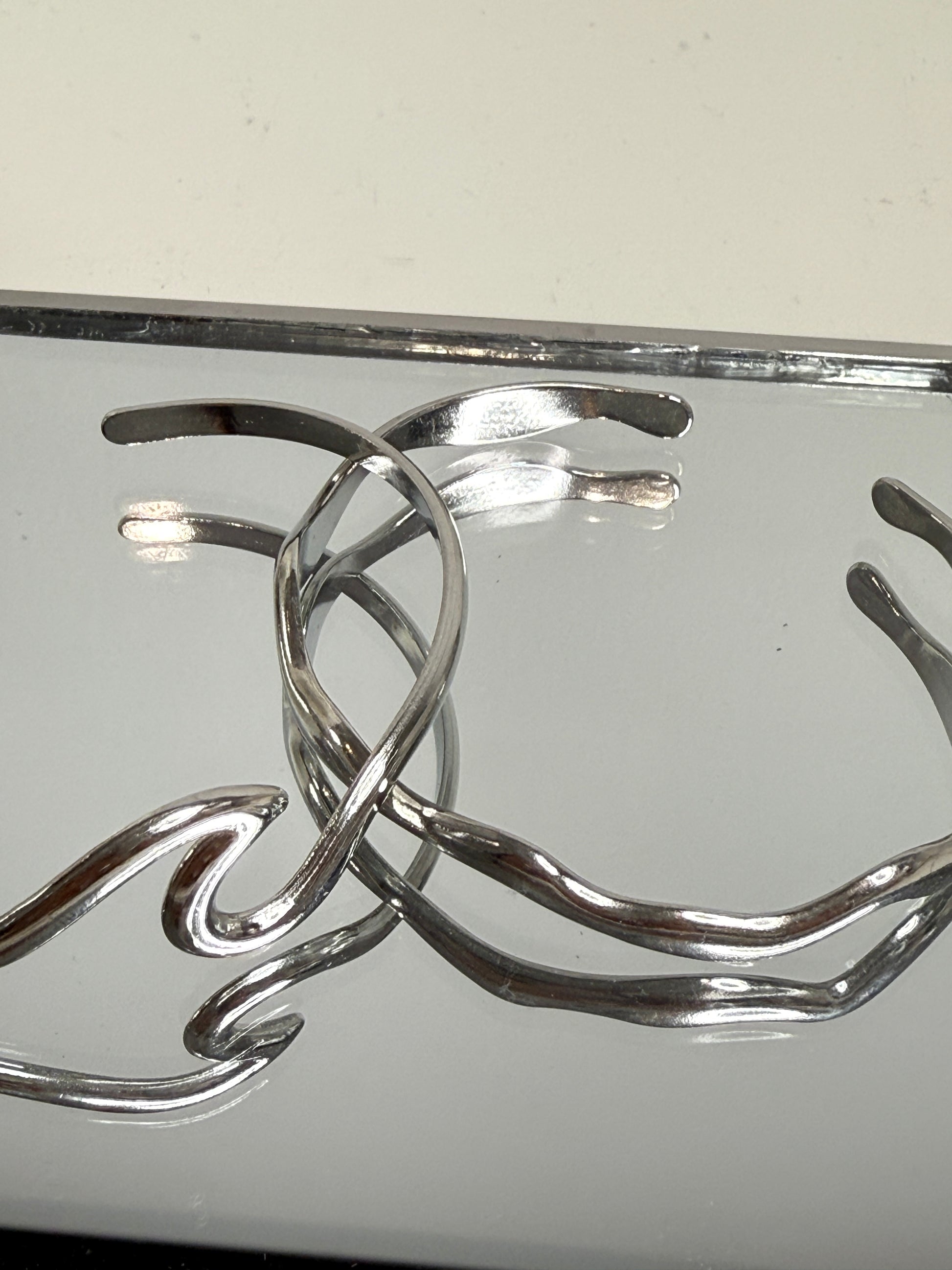 This stainless steel adjustable bangle features an uneven, organic design that flows up and down along the band, creating a dynamic and sculptural look. The smooth, polished finish highlights its unique shape, while the adjustable feature ensures a comfortable, customizable fit. Perfect for adding an edgy yet sophisticated touch to any outfit, this bangle is a statement piece for those who appreciate modern, artistic design.