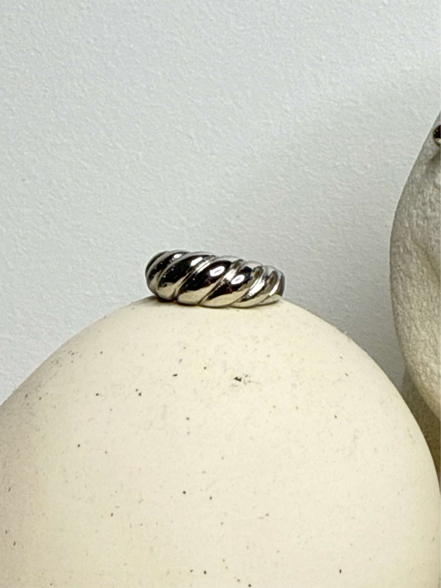 A chic stainless steal ring designed in the shape of a buttery, flaky croissant. With its elegant curves and textured detailing, this stylish piece adds a touch of Parisian charm to any look. Perfect for fashion lovers with a taste for the finer things!