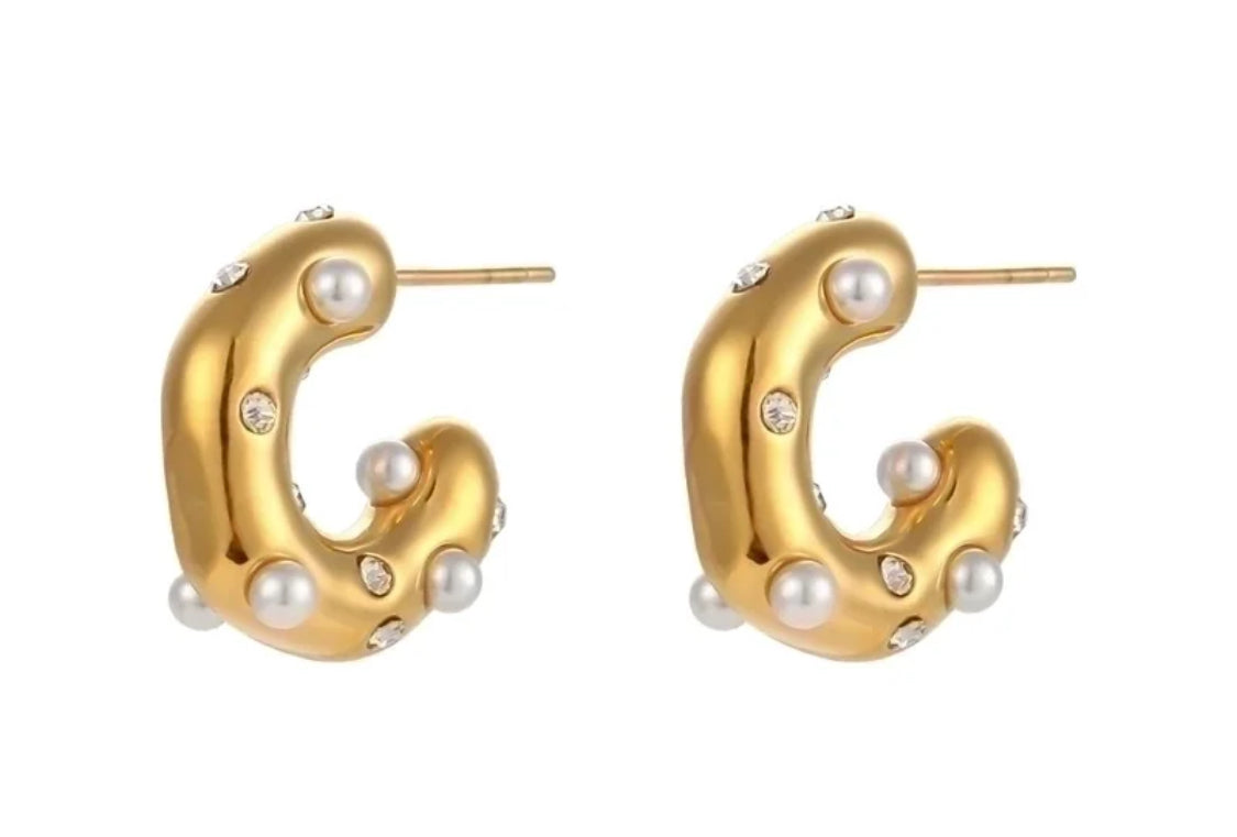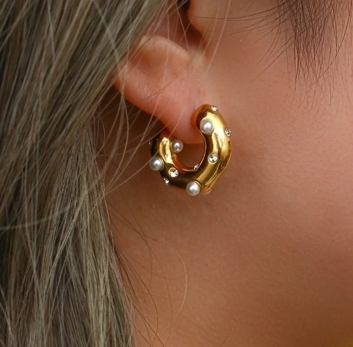Add a touch of modern elegance with these 18k gold-plated earrings, designed in a sculptural, organic hoop shape. Each piece is embellished with delicate imitation pearls and sparkling crystal accents, creating a luxurious blend of texture and shine. Finished with a comfortable stud-pin closure, these earrings are perfect for elevating both everyday outfits and special-occasion looks.