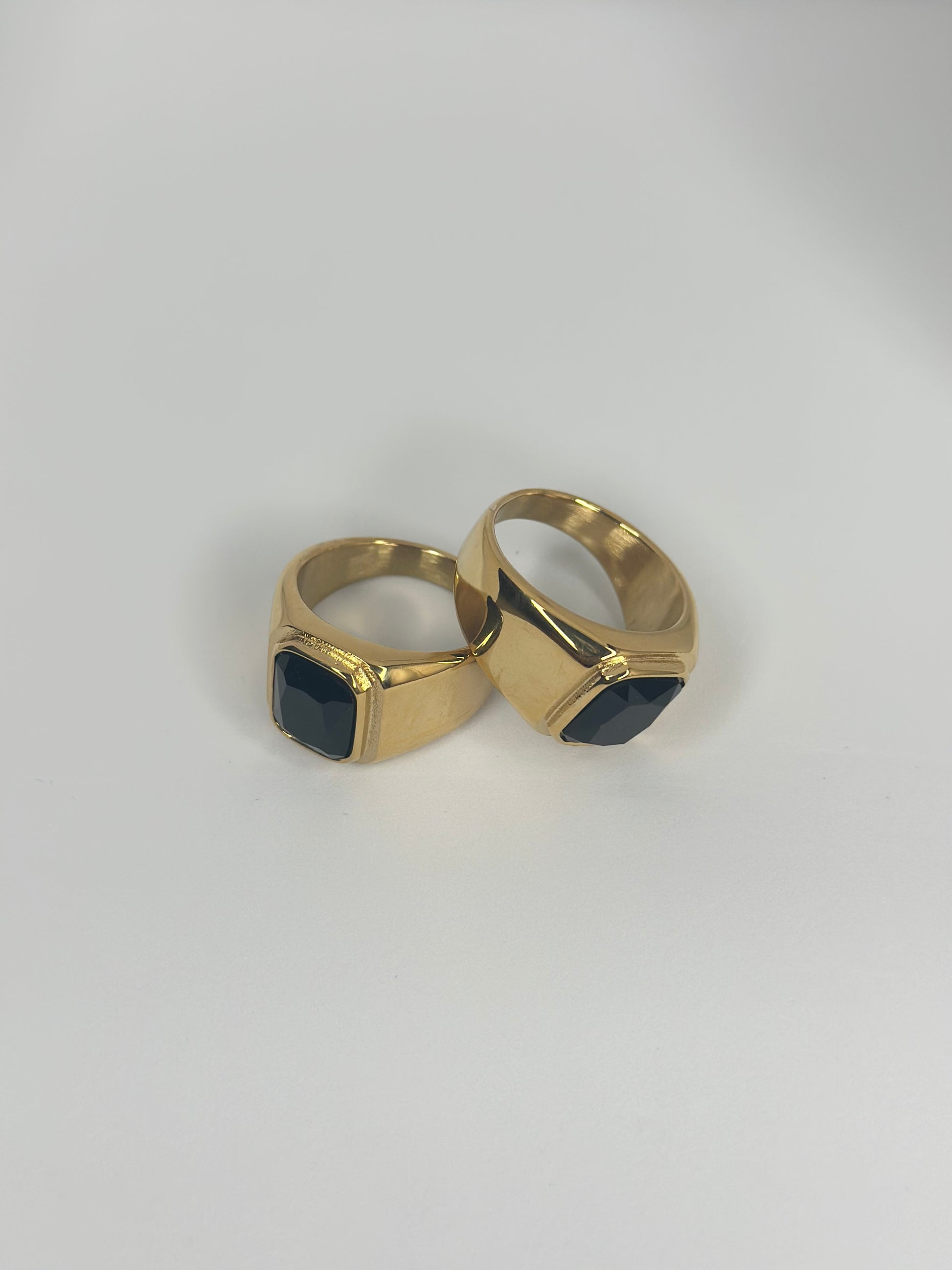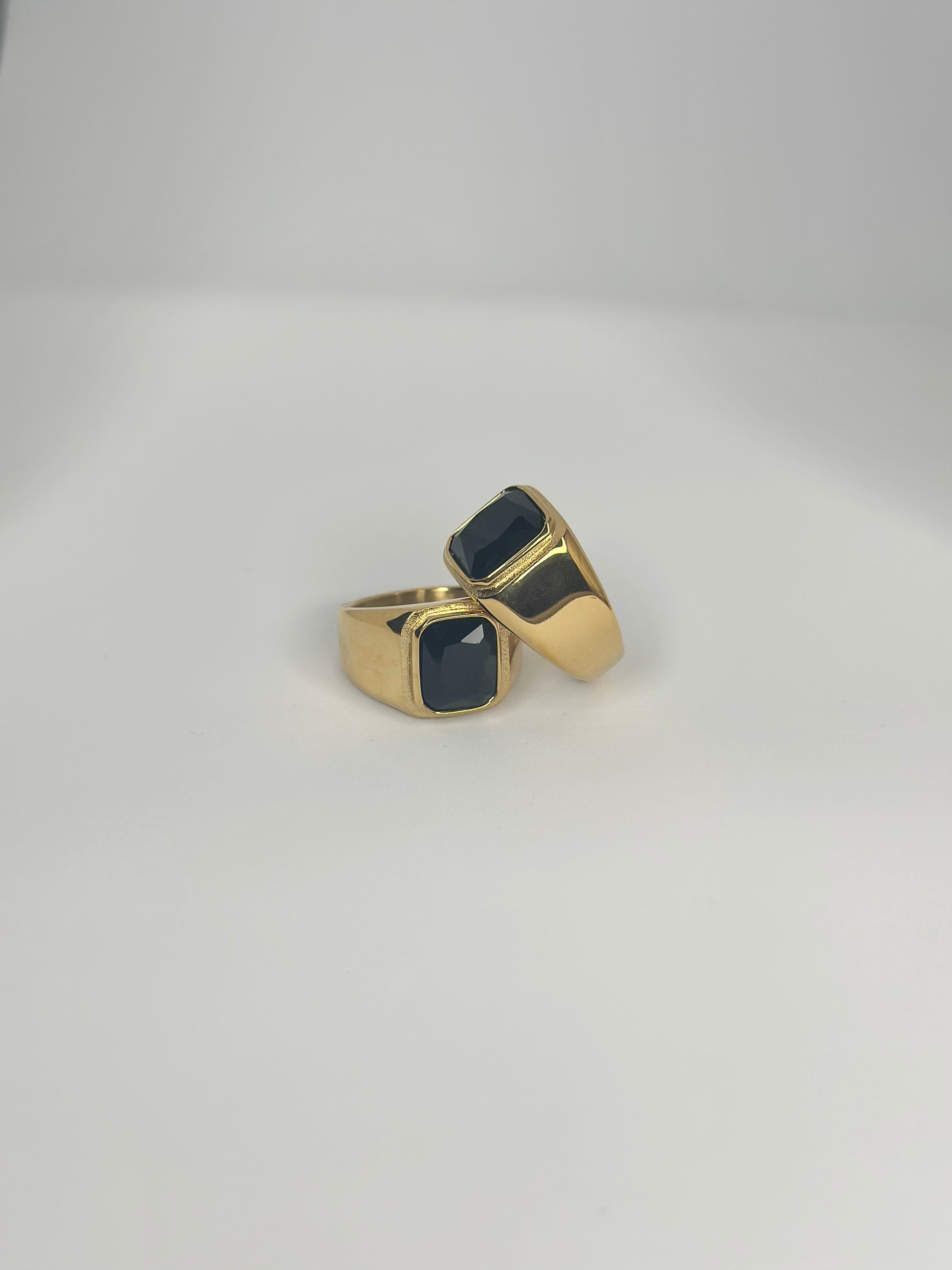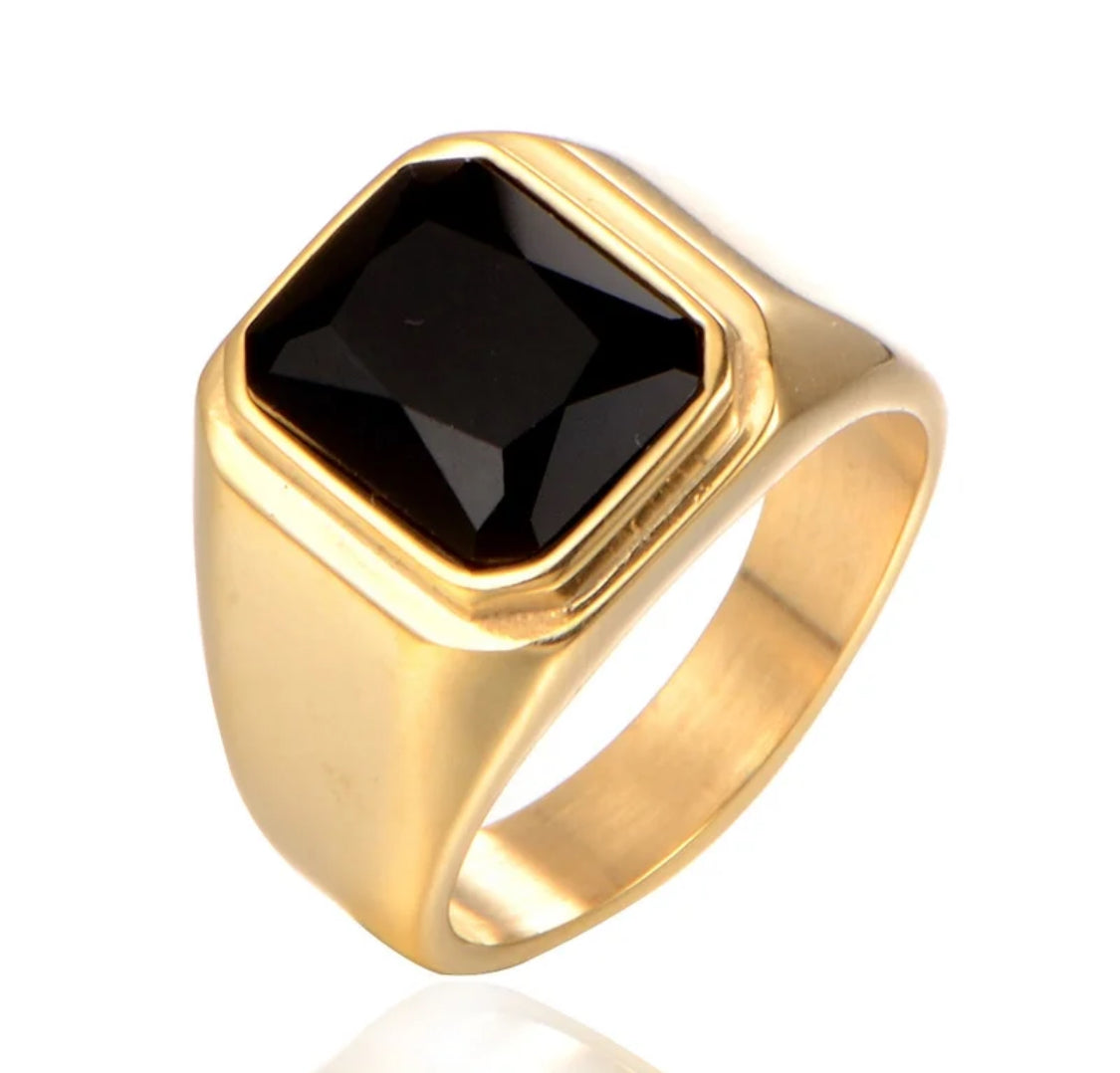 Elevate your style with this 18k gold-plated men’s ring, featuring a sleek inlay of deep glass-cut gemstone. Its bold, modern silhouette and reflective high-polish finish make it the perfect statement piece for everyday wear or special occasions. Durable, striking, and effortlessly sophisticated.