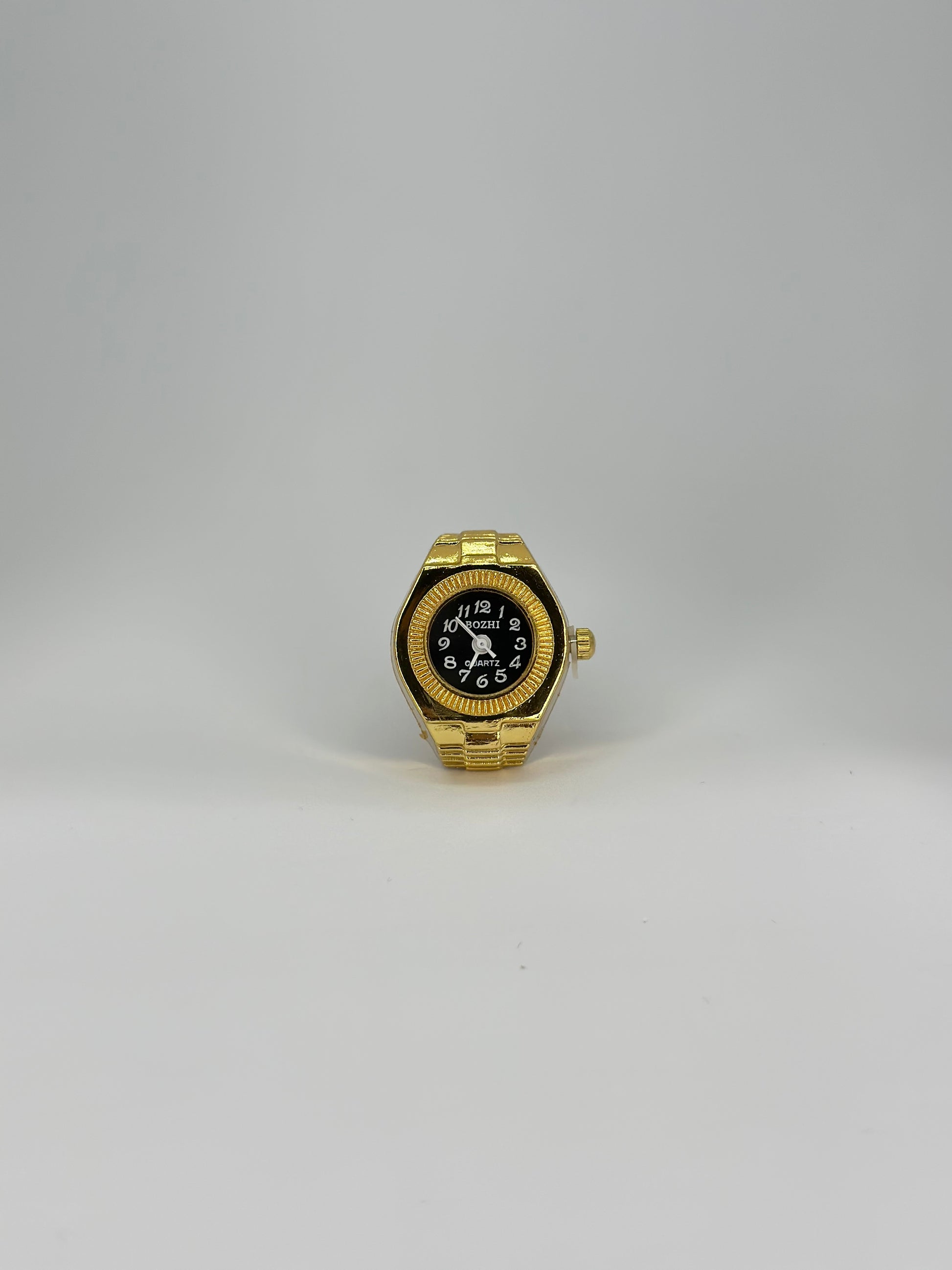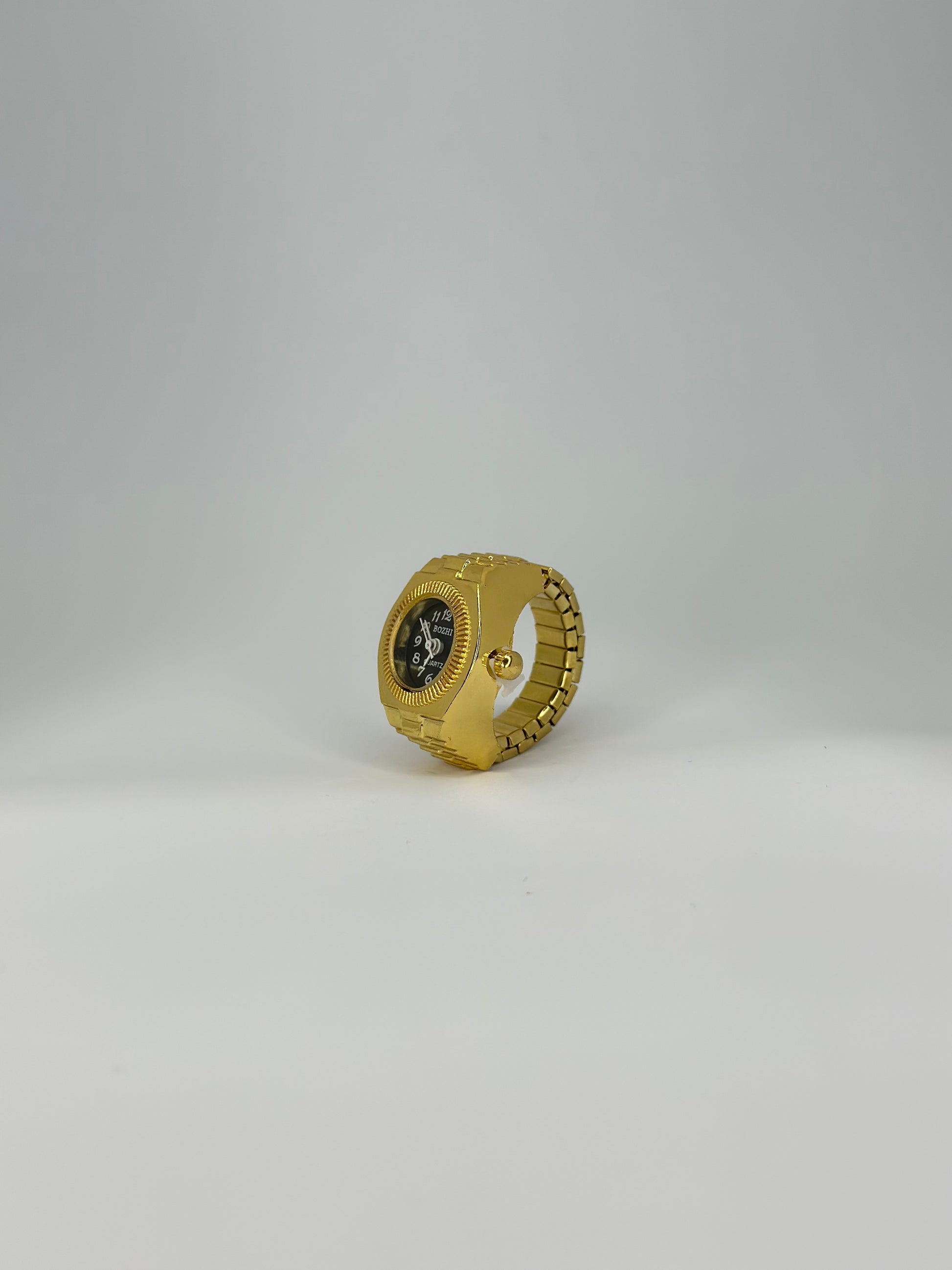 Refined and versatile, this piece brings together classic design and modern practicality. Its polished gold frame and rounded silhouette encase a deep black watch face, enhanced by striking white numerals for timeless elegance. The adjustable stretch band ensures a comfortable fit for any finger, making it as functional as it is stylish. A subtle yet sophisticated piece, this ring watch is the perfect fusion of jewellery and timekeeping, designed to complement every look with understated luxury.