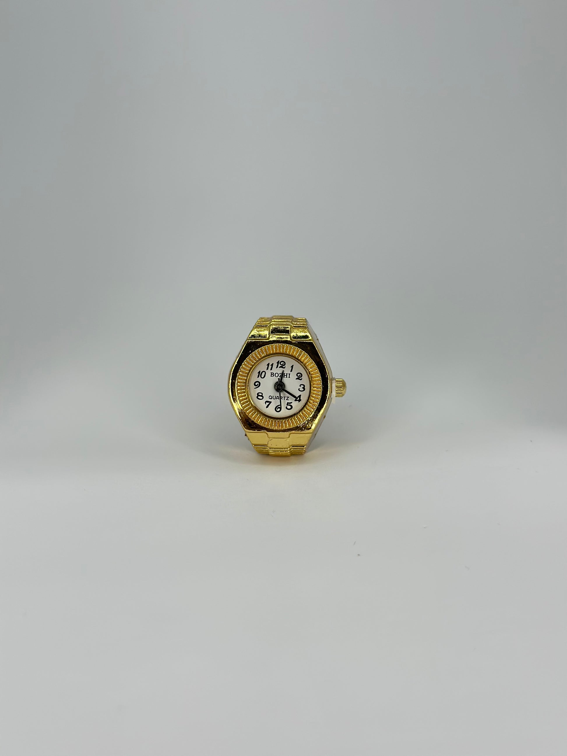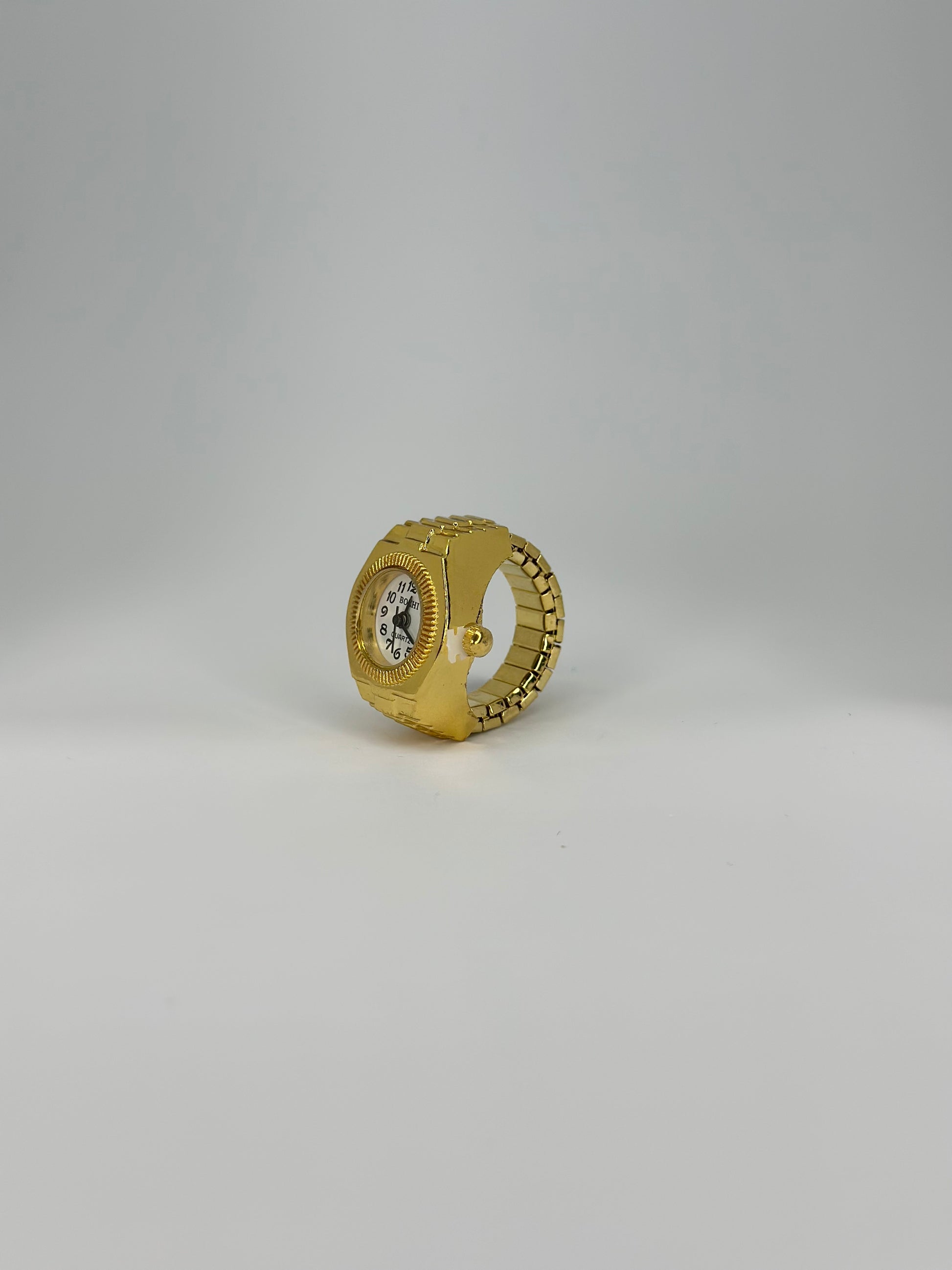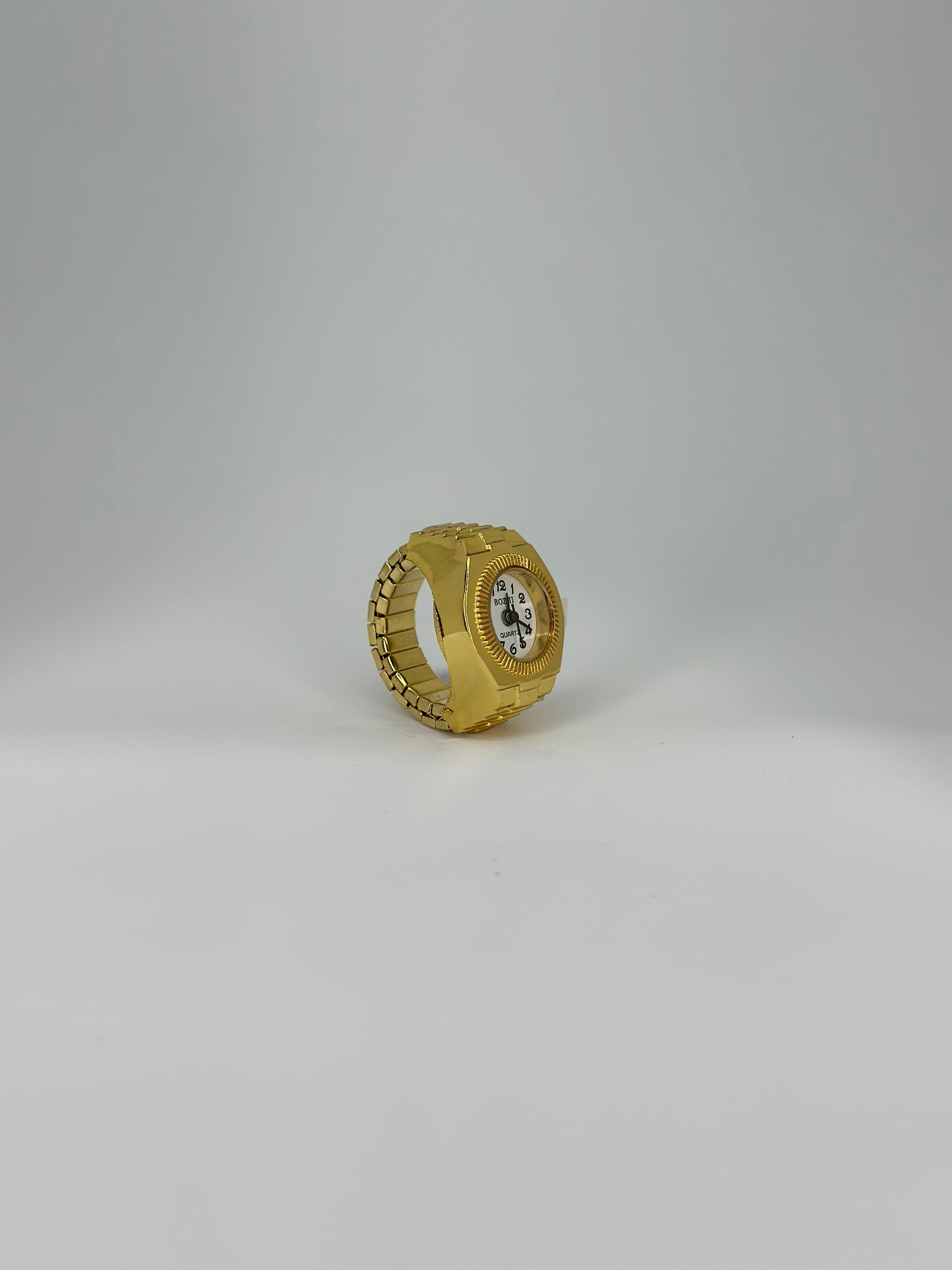 Refined and versatile, this piece brings together classic design and modern practicality. Its polished gold frame and rounded silhouette encase a crisp white watch face, enhanced by striking black numerals for timeless elegance. The adjustable stretch band ensures a comfortable fit for any finger, making it as functional as it is stylish. A subtle yet sophisticated piece, this ring watch is the perfect fusion of jewellery and timekeeping, designed to complement every look with understated luxury.