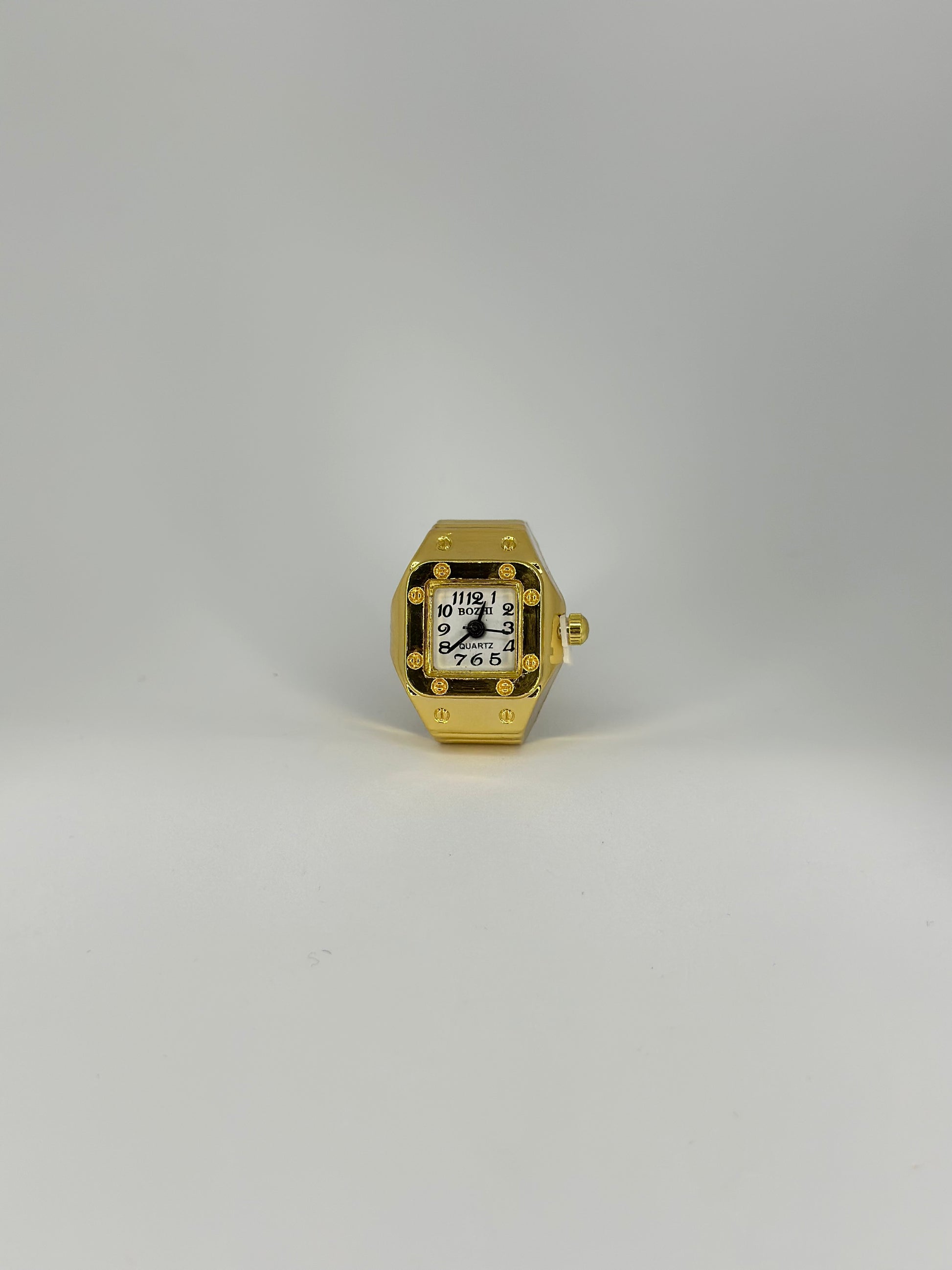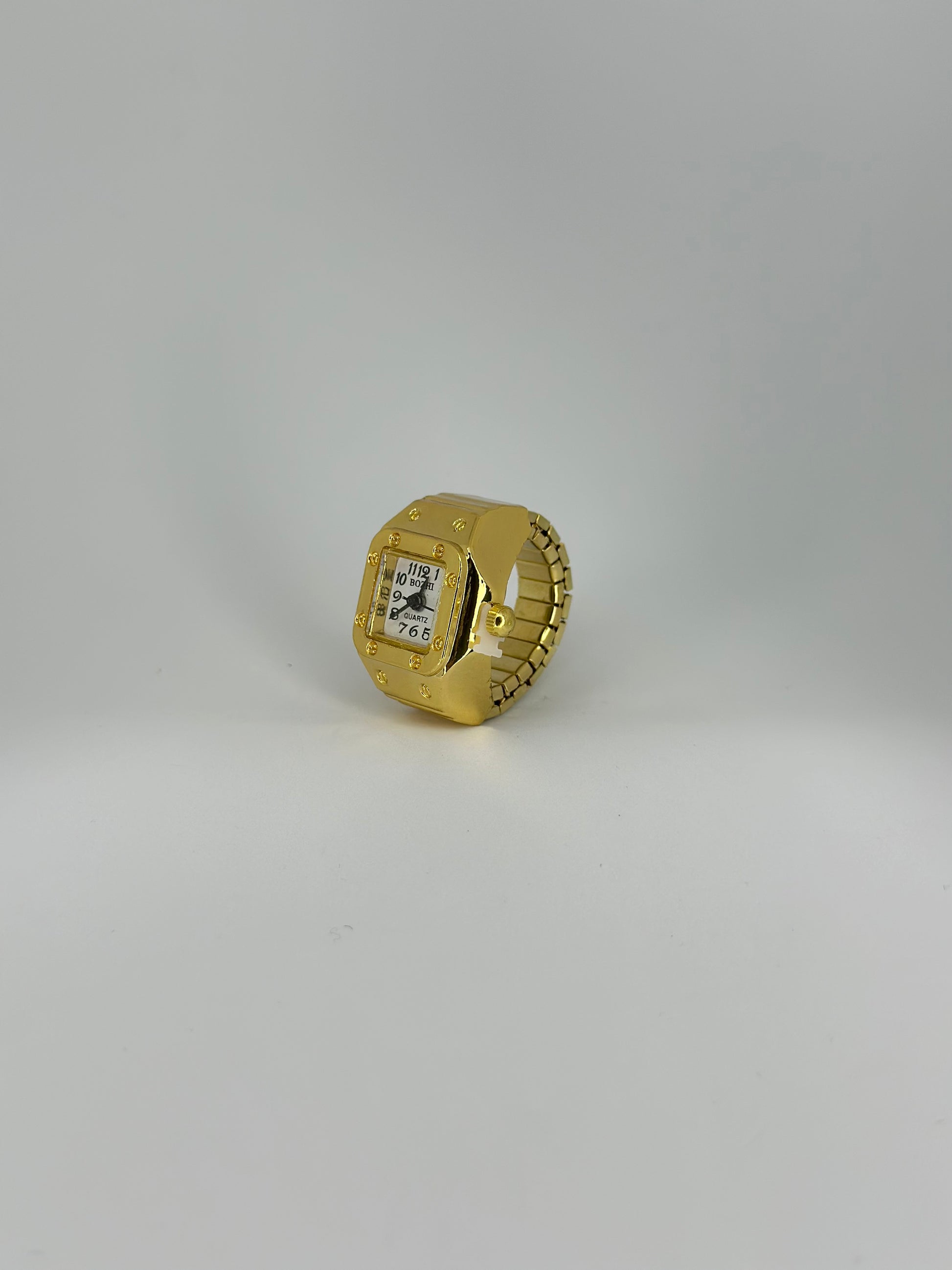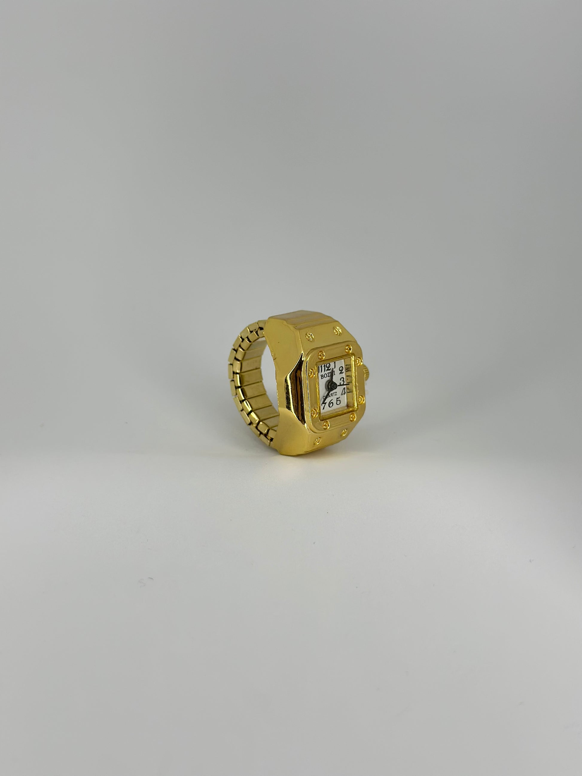 Elevate your style with the Reposado Ring Watch, a unique fusion of jewellery and timekeeping. Crafted in a polished gold finish, its bold square-shaped frame is accented by a clean white watch face that creates a striking contrast with the deep black numerals. Designed with an adjustable stretch band, this piece ensures a comfortable fit for any finger while maintaining its statement-making elegance. A perfect balance of luxury and practicality, this ring watch brings sophistication to every glance.