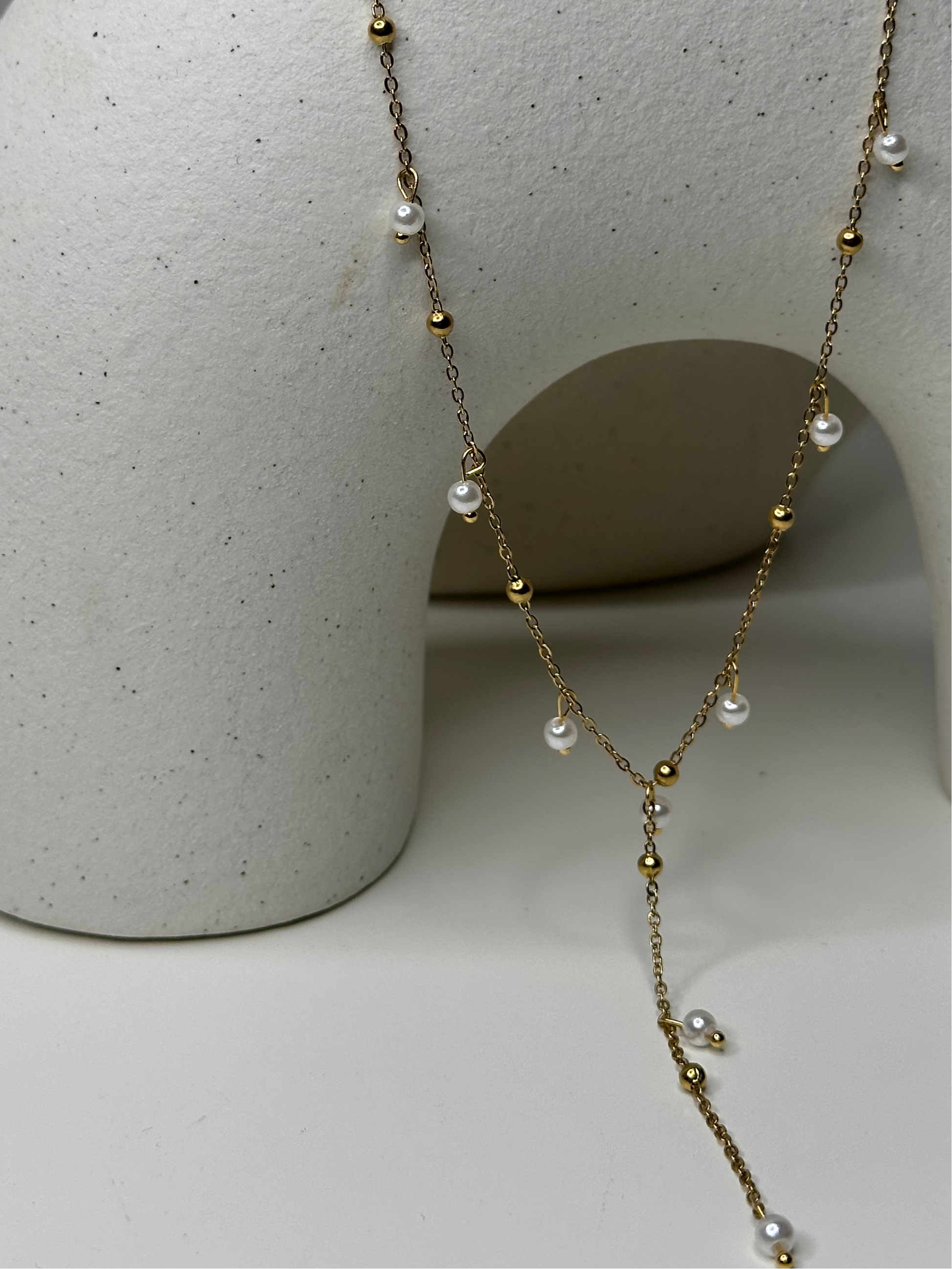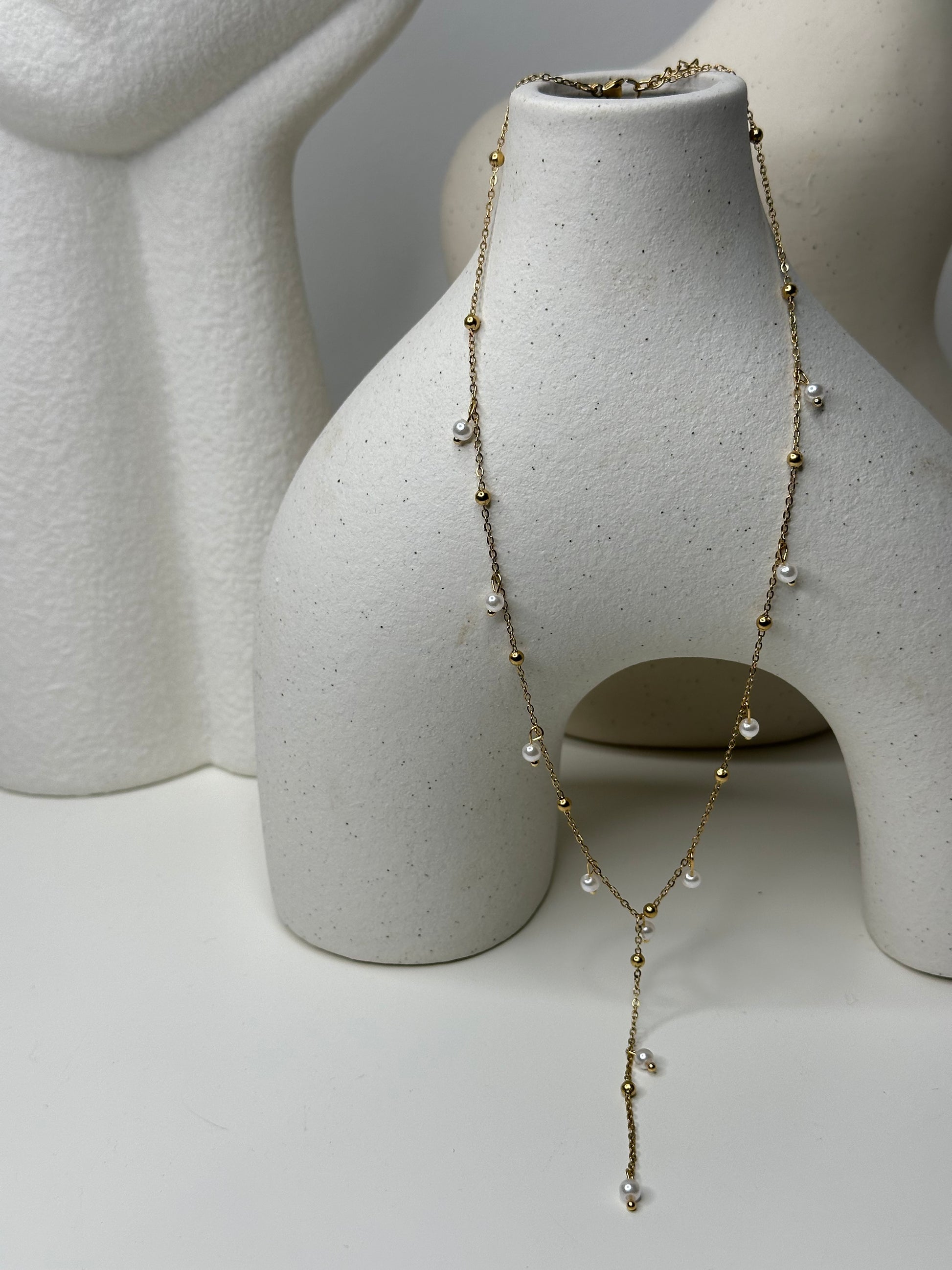 This gold-plated necklace elegantly drops down to the décolletage, featuring a delicate chain adorned with pearl imitation sphere balls that gracefully hang for a refined, luxurious touch. The combination of the warm gold and soft, lustrous pearls adds a timeless elegance, making this necklace perfect for both formal occasions and everyday sophistication.