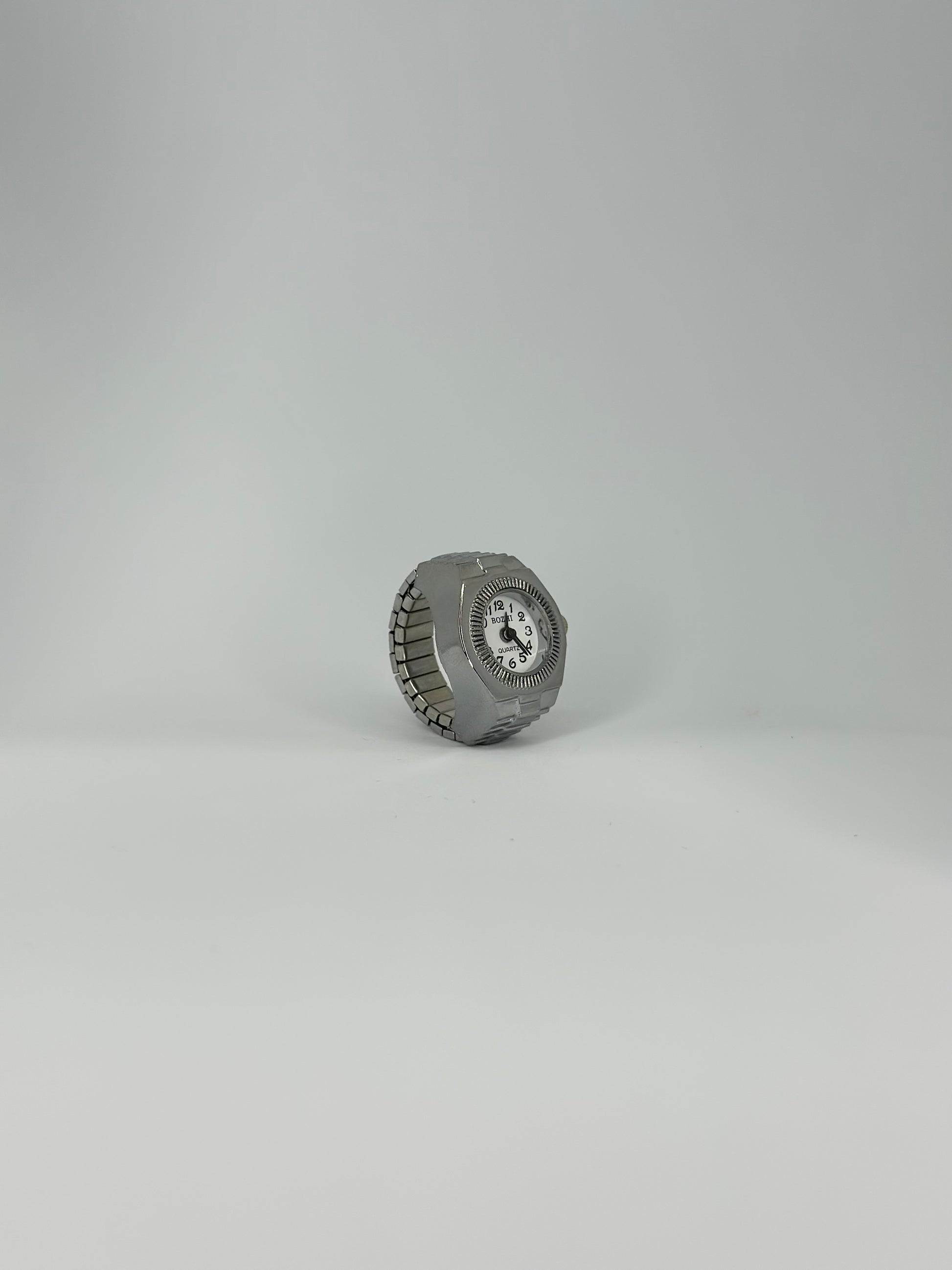 Refined and versatile, this piece brings together classic design and modern practicality. Its polished silver frame and rounded silhouette encase a crisp white watch face, enhanced by striking black numerals for timeless elegance. The adjustable stretch band ensures a comfortable fit for any finger, making it as functional as it is stylish. A subtle yet sophisticated piece, this ring watch is the perfect fusion of jewellery and timekeeping, designed to complement every look with understated luxury.